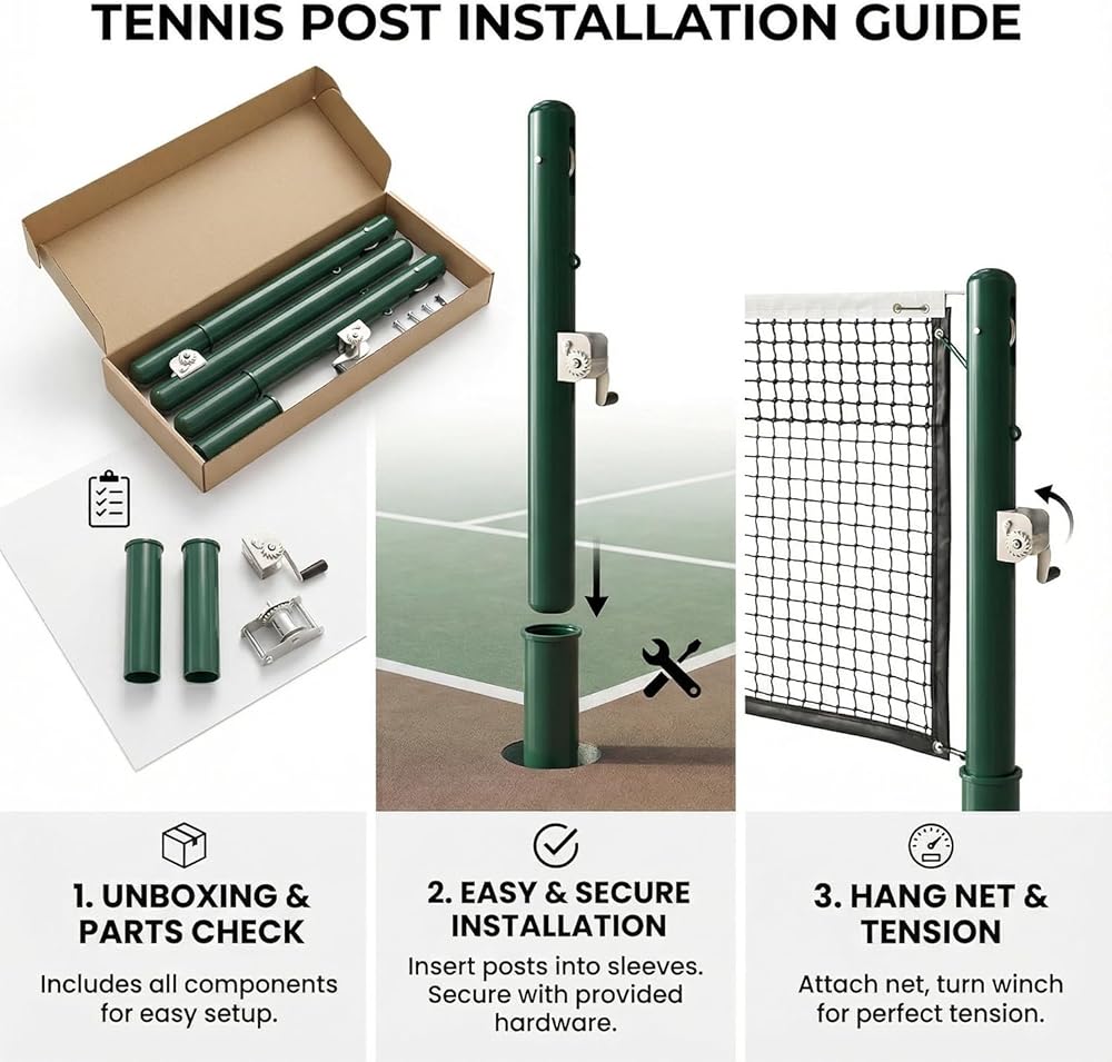 PERMANENT & FIXED INSTALLATION: This is a complete set of non-adjustable, fixed tennis posts designed for a permanent court. The kit includes heavy-duty ground sleeves that embed into the ground, providing an ultra-stable and wobble-free foundation for your tennis net (No net).