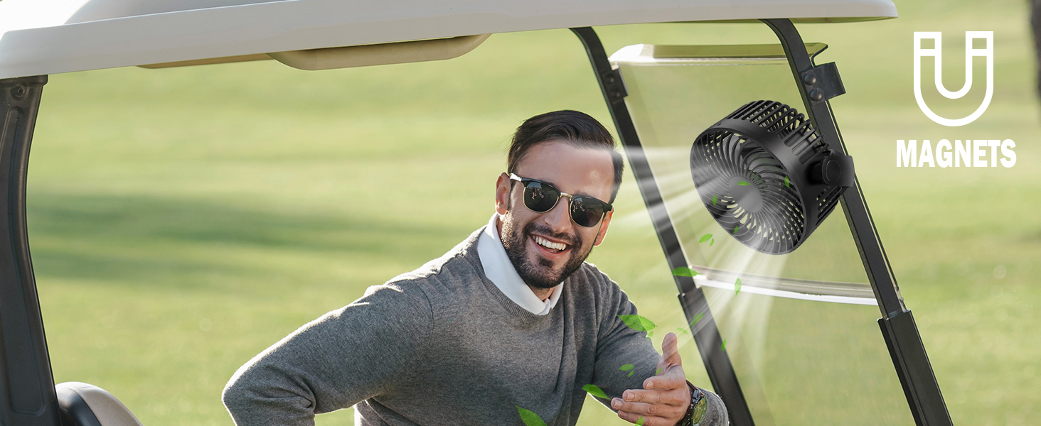 【Powerful Magnetic Base for Secure Attachment】This magnetic fan features a 1-inch big magnet that firmly adheres to any metal surface for effortless one-touch installation and removal. An additional velcro strap ensures double security, preventing falls during bumpy golf cart rides. A must-have golf cart accessory, allowing you to stay cool and comfortable on the course.