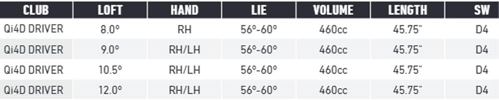 Qi4D drivers utilize refined shaping, multimaterial construction, a faster face with a new and improved roll radius, and four moveable Trajectory Adjustment System (TAS) weights to provide you with the perfect blend of speed and forgiveness off the tee.
