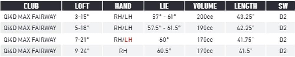 SPEED THROUGH FORGIVENESS The Qi4D Max fairway is designed for golfers who are looking for a fairway that's easy to launch due to a shallower face with maximum forgiveness. The massive 200cc head is 17% larger than the Tour model and 5% larger than the standard model, offering a significant confidence boost. It's our mini-mini driver.