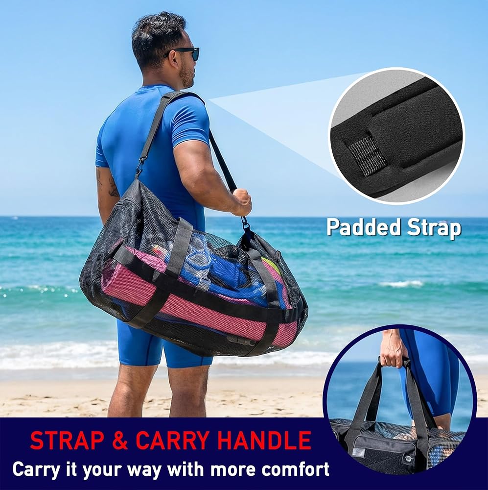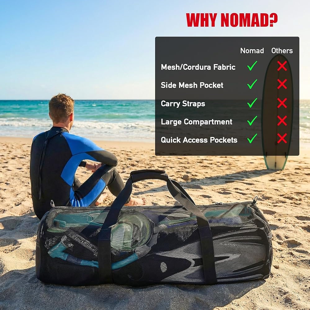 Breathable & Fully Washable: Don't let wet towels and gear that's been wrung out in heavy sweat make the whole mesh gear bag smell bad. The damp, sealed storage can be bad for your diving gear. The design of our premium mesh beach bag guarantees decent airflow, allowing damp diving gear and wet towels to dry naturally. Above all, this Nomad mesh tote bag is fully washable. Just give it a simple wash, and this duffel bag will look and smell like new.