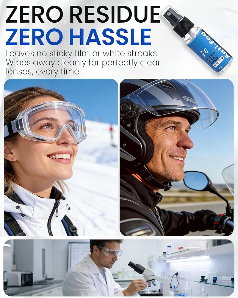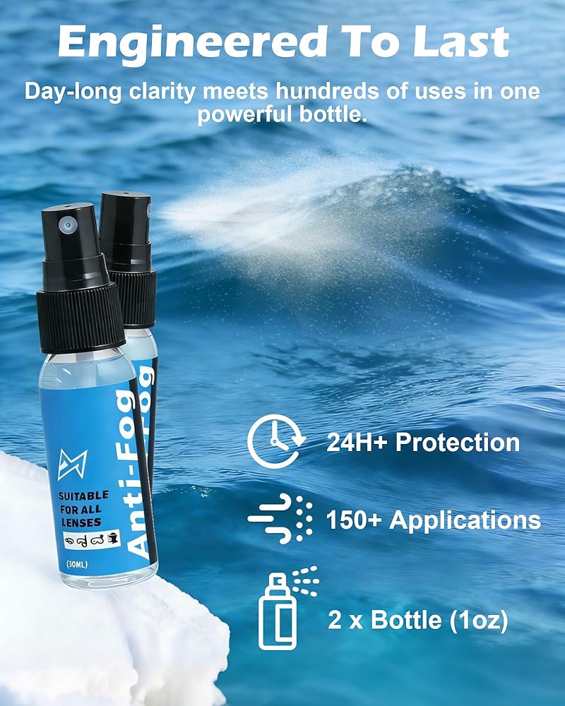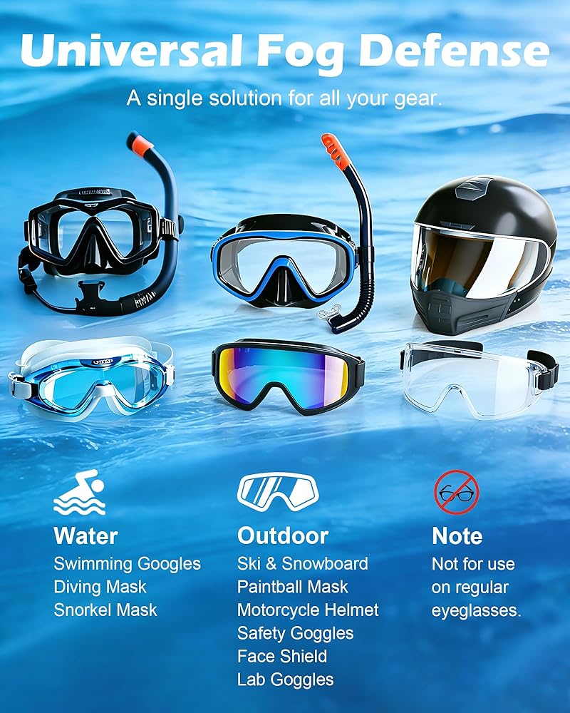 【Quick-Acting Formula】Get instant clarity with our fast-acting anti-fog spray. It creates a long-lasting protective layer to prevent fog on swim goggles, diving masks, ski goggles, motorcycle helmets, and most plastic lenses—perfect for any water sport, winter activity, or ride. ❌ Note: Not for use on regular eyeglasses.