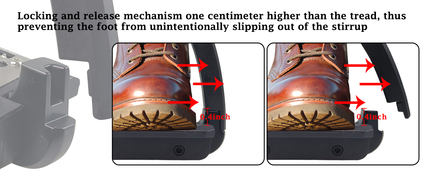 Locking and release mechanism one centimeter higher than the tread, thus preventing the foot from unintentionally slipping out of the stirrup