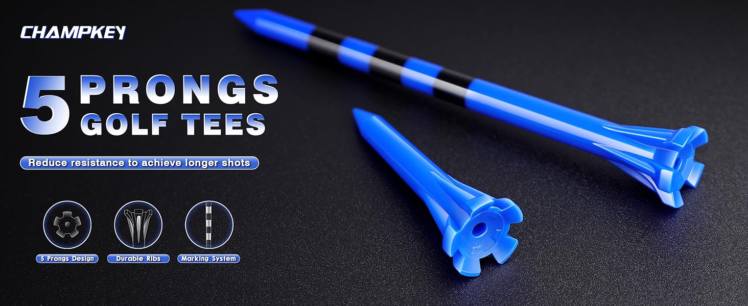 CHAMPKEY Advanced 5-Prong Plastic Golf Tees 120 or 100 Pack - 50% Ball Contact Surface Optimization with Longer Distance Performance Golf Tees Plastic