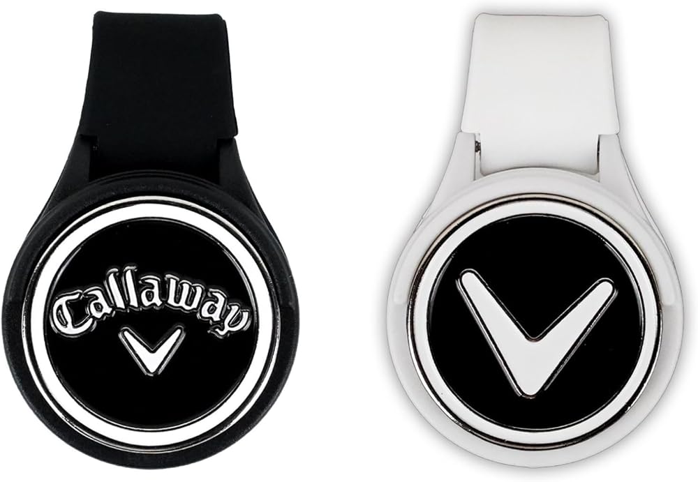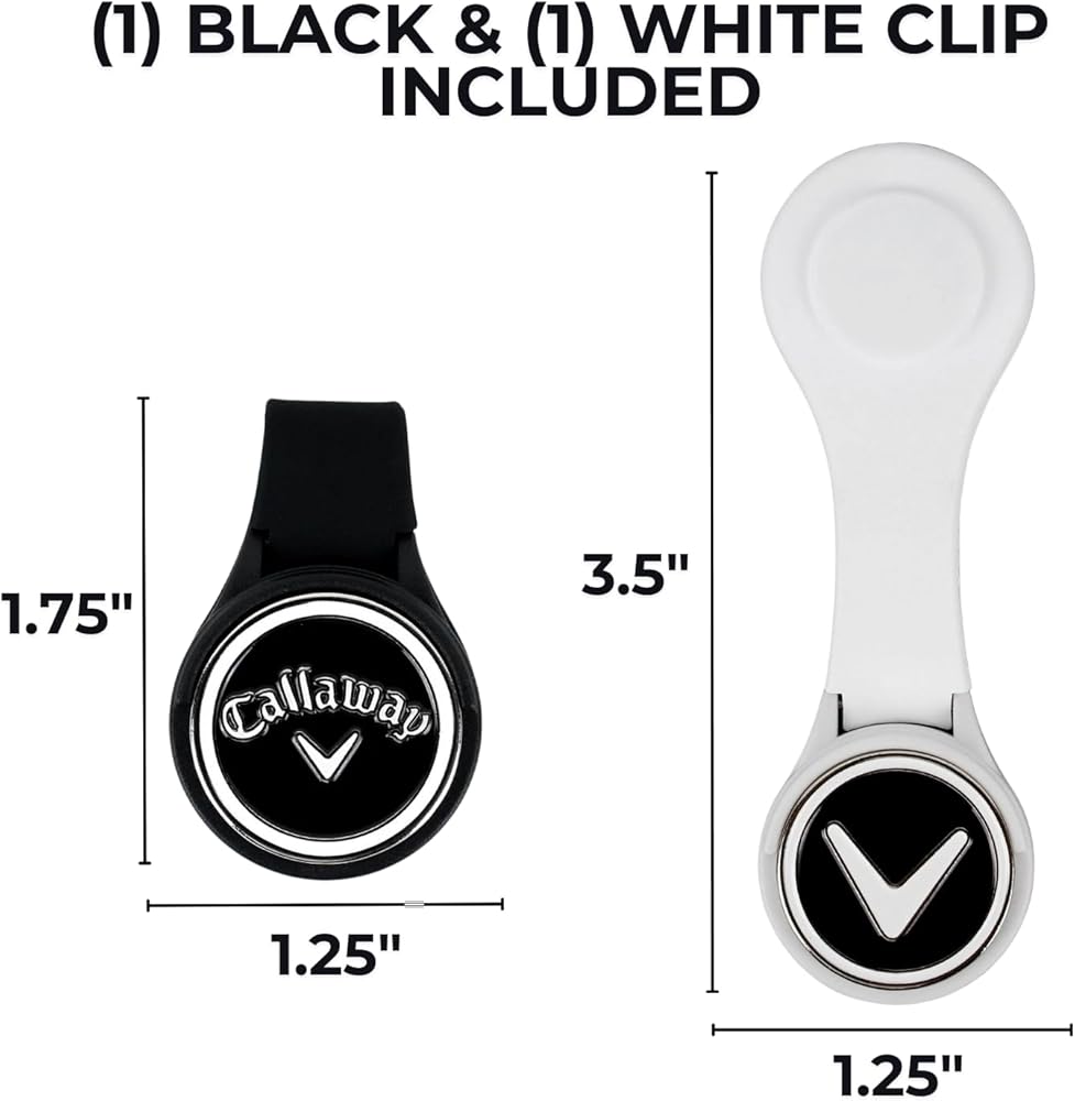 Introducing the Callaway Golf Magnetic Ball Maker Hat and Pocket Clip. The clip features strong integrated magnets designed to securely fasten the ball marker to the clip and to ensure the silicone clip stays on your hat, belt or pocket while you swing. These magnets are strong enough to make sure you never lose the ball marker or clip but also allow you to remove the ball marker or clip with little effort. The silicone hat/pocket clip features a removable metal ball marker that can be easily taken on and off making it quick and easy to mark your golf ball on the green. The clip's versatile design allows you to use it as a hat clip or a pocket clip, catering to your preference. The hat and pocket clip is made from a durable silicone material designed to handle the rigors of the golf course and your swing. The hat and pocket clip is sold as a 2-pack that comes with 1 white clip and 1 black clip.