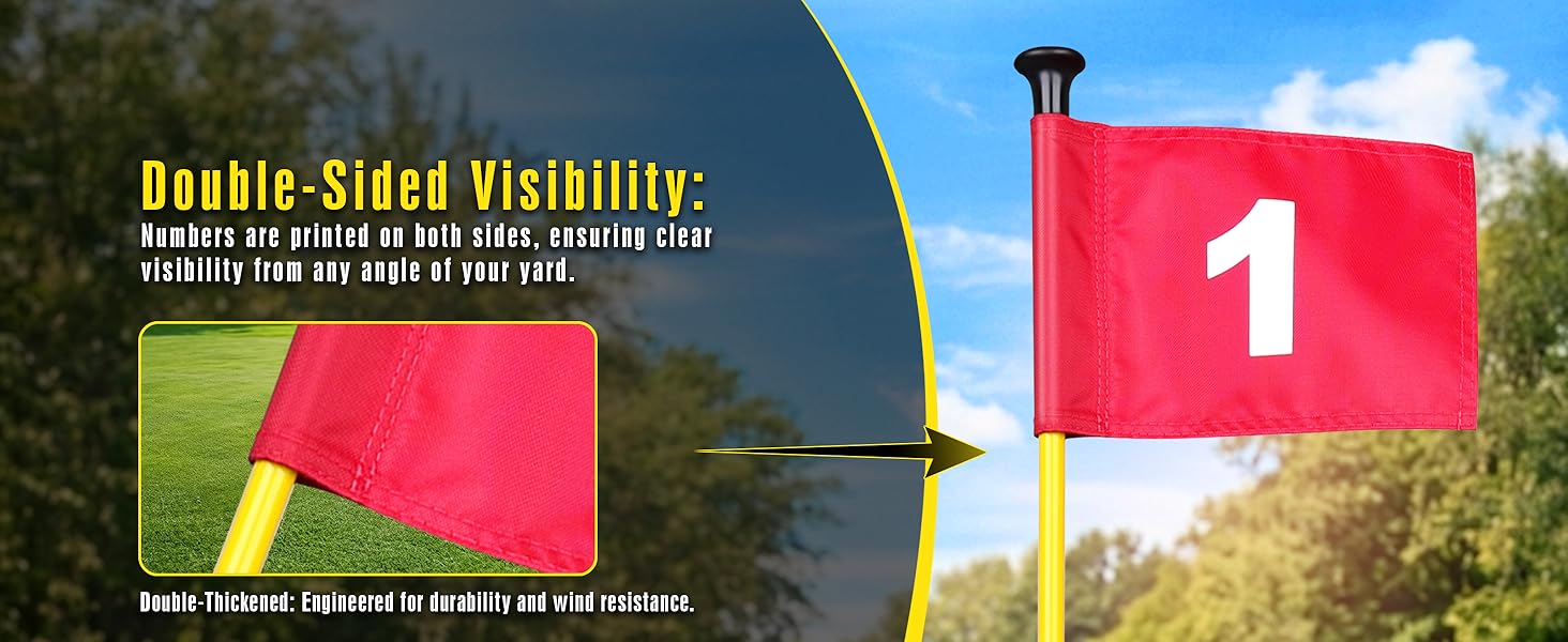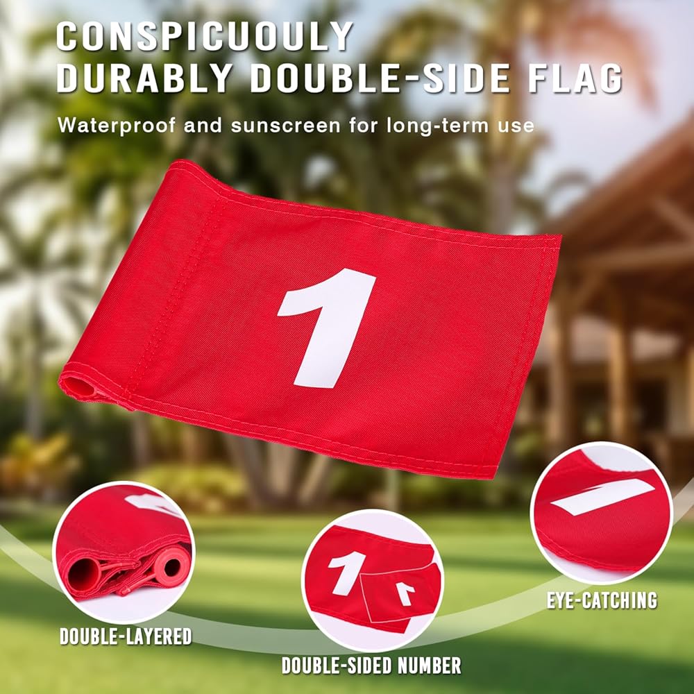 Double-Sided Layered Flag for Clear Visibility:Our golf flag features a double-layer, double-sided number design, so the hole number stays visible from any angle. The premium stitching keeps the flag flat and vibrant, adding an authentic professional putting green look to your backyard practice setup
