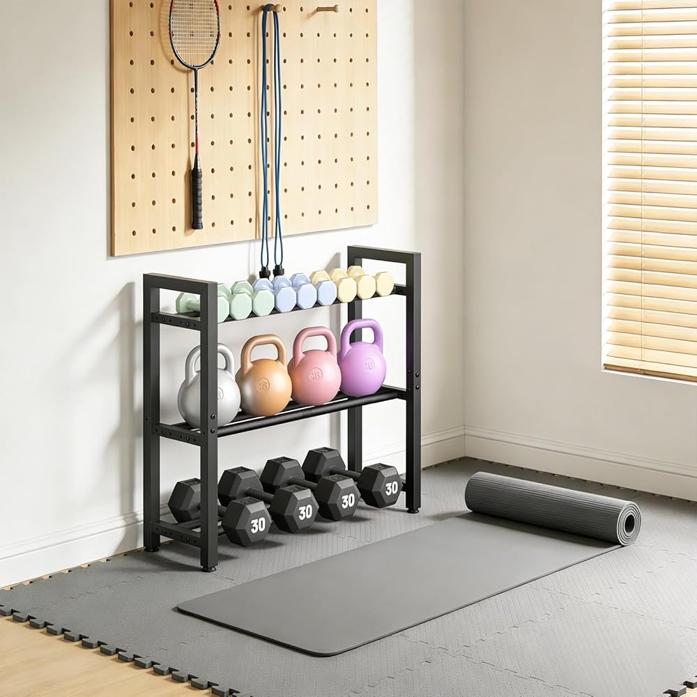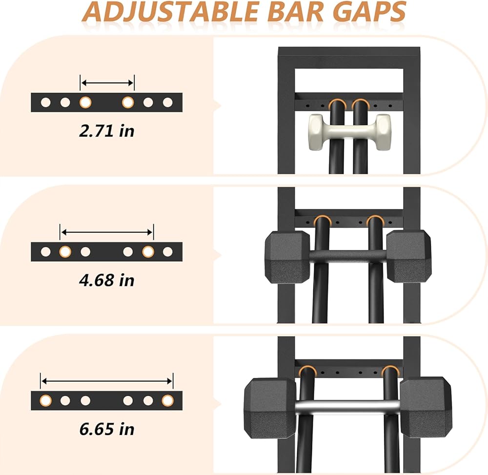 Adjustable Width for All Your Gear: The horizontal bars can be adjusted from about 2.7" to 6.7" with multiple spacing levels, so it fits dumbbells, kettlebells, and weight plates easily. (Dumbbells not included)