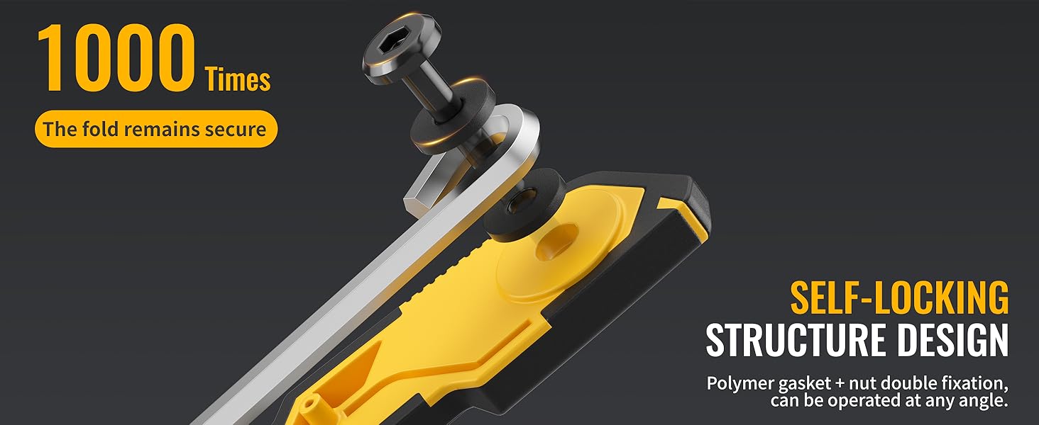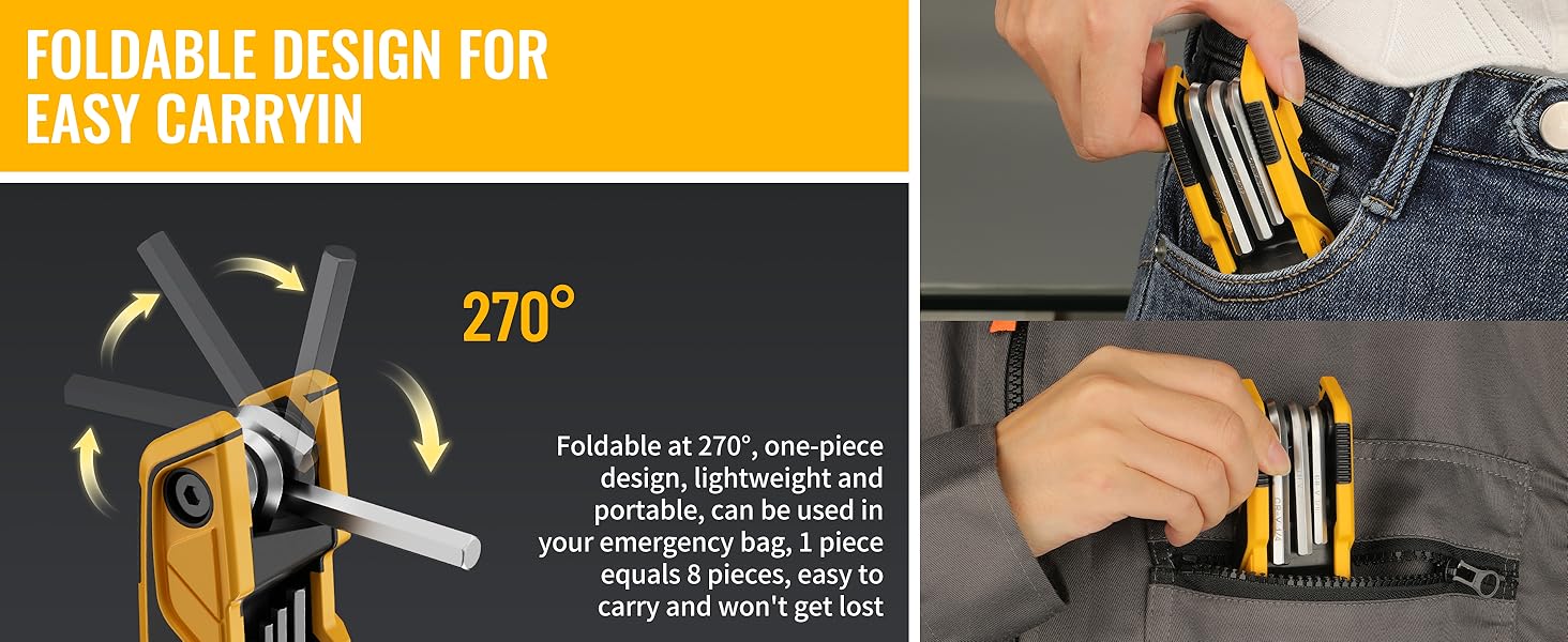 Self-Locking Structure Folding Design: Double fixed with polymer washers and nuts, can be operated at any angle from multiple angles, and will not loosen after repeated folding. The foldable hex wrench set folds at an angle of 270°, is lightweight and portable, and can be used in your emergency bag. Ideal for working in small spaces and a variety of environments. The perfect allen wrench tool for mechanics, bike and DIY enthusiasts
