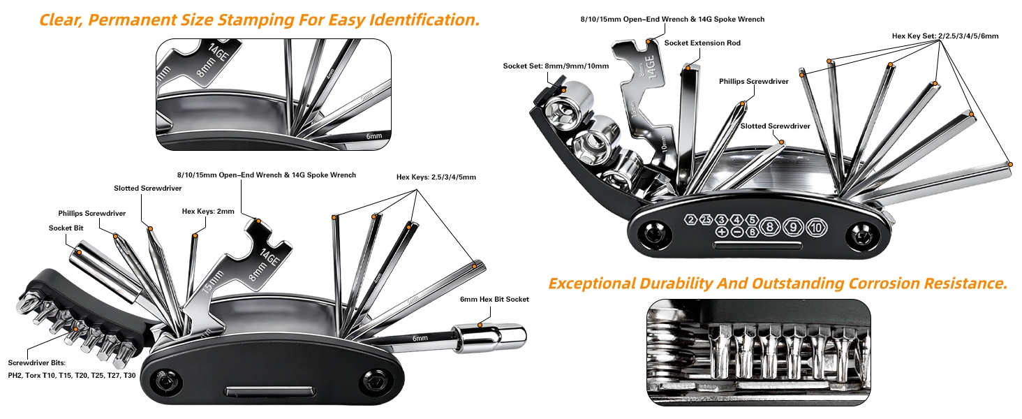 16-in-1 Professional Bike Repair Kit: This multifunction tool combines a 2/2.5/3/4/5/6mm hex key set, 8/9/10mm socket set, Phillips/slotted screwdrivers, Torx bits (T10-T30), open-end wrenches (8/10/15mm), and a 14G spoke wrench. All tools are crafted from corrosion-resistant chrome vanadium steel to withstand high torque and ensure durability during repairs