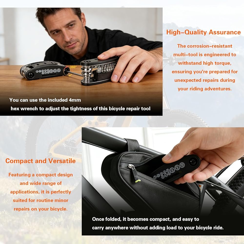 Compact & Portable Design for On-the-Go Repairs: Foldable and lightweight, this bike multitool easily fits in your pocket, bike bag, or tool kit holder without adding bulk. Perfect as a portable bicycle repair tool kit for mountain biking, road cycling, e-bike maintenance, and emergency roadside fixes