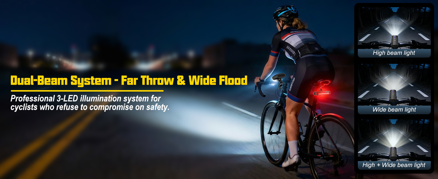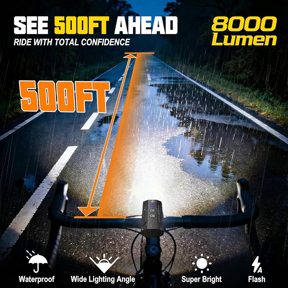 8000LM Extreme Brightness & 13 Modes: Featuring 3 upgraded LEDs, this bike headlight delivers a staggering 8000 lumens. Choose from 13 versatile modes: High Beam (Cool White), Wide Beam (Warm Yellow - anti-glare), or Combo modes to conquer any terrain from pitch-black trails to foggy city streets