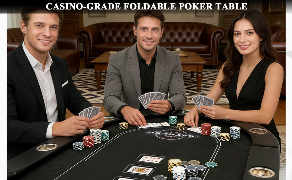 【Premium Construction& Stability】Built for durability, our foldable poker table features a reinforced MDF frame and heavy-duty steel legs that lock securely in place. The surface is covered in professional-grade smooth felt, ensuring cards slide effortlessly. Unlike flimsy tables, the non-slip foot pads provide solid stability on any floor surface, preventing wobbling during critical game moments.
