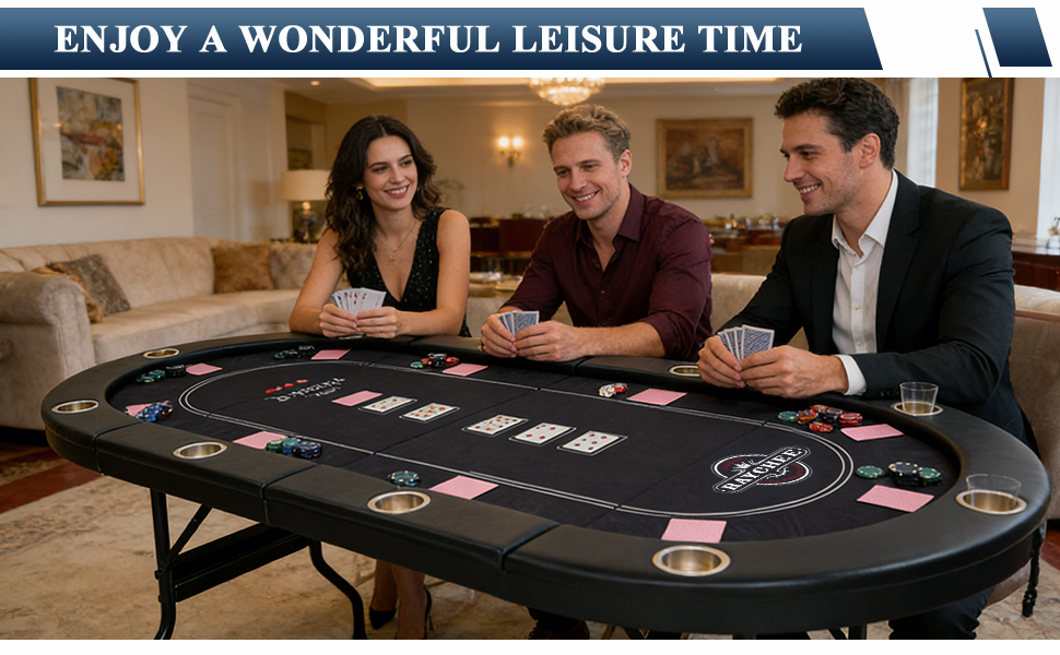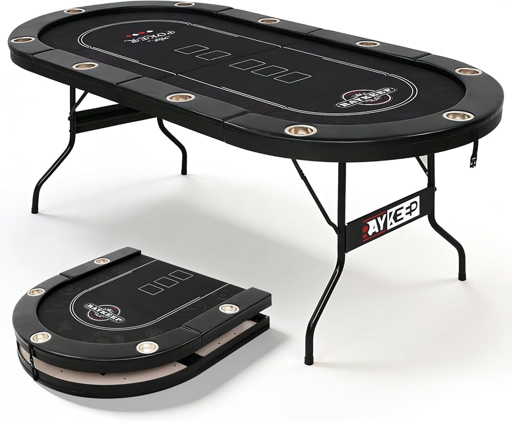 【10-Players Professional Poker Table】The RAYKEEP full-size poker table features a spacious oval layout that accommodates up to 10 players, ensuring everyone has their own designated gaming area. It is perfectly sized for casino classics like Texas Hold'em, Blackjack, and board games. Ideal for family nights, stag parties, or team-building events, creating a professional gaming atmosphere right at home.