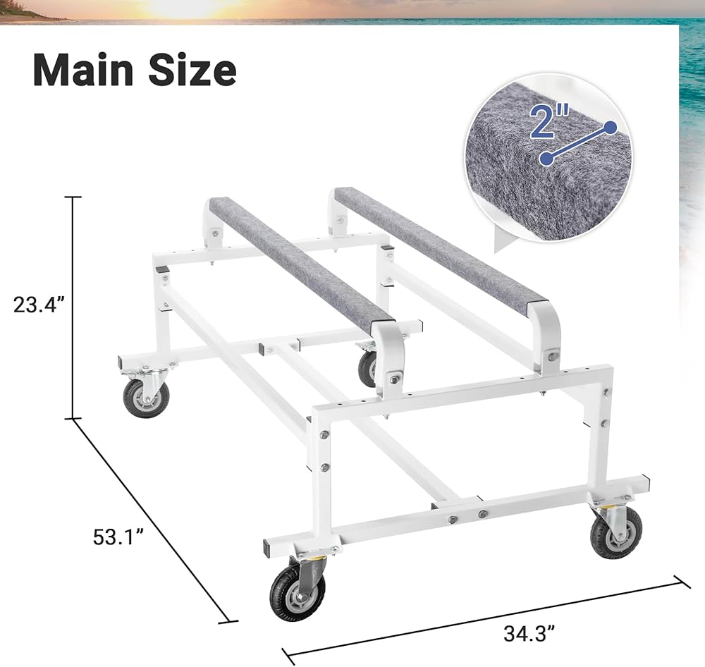 Large Load Capacity: Our Updated heavy-duty jet ski dolly can hold up to 1,000 pounds and is suitable for a variety of watercraft such as jet skis, boats, surfers and inflatables. Main Size: 53.1”L x 34.3”W x 23.4” H