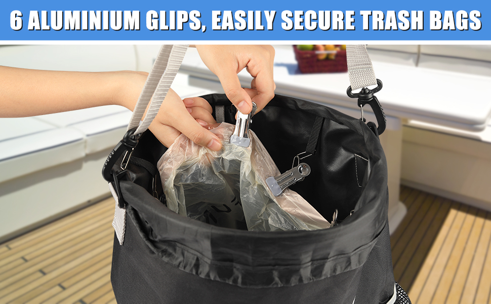 【Thoughtful Design with Integrated Convenient Clips】: NewShot waterproof boat trash can with 6 clips that securely fasten 10-13 gallon bin liners. The rubber-coated clips prevent liners from slipping while protecting hands and liners from scratches