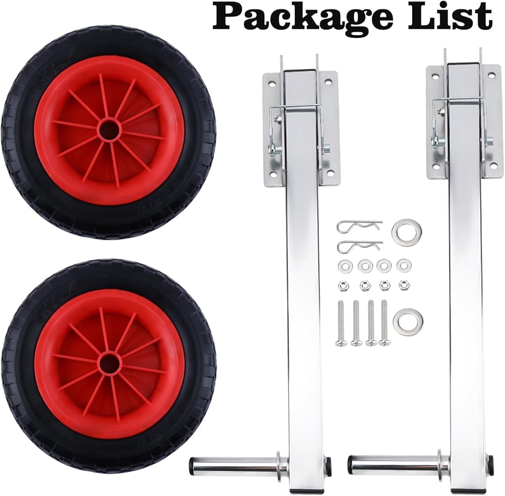 Boat Launching Wheels Product Description Tired of struggling to launch or retrieve your boat alone? Our 10" Removable Boat Transom Launching Dolly Wheels are designed to take the hassle out of boat handling, making every launch and retrieval smooth, effortless, and stress-free—perfect for inflatable boats, Jon boats, and most transom-mounted small boats. Premium Design for Durability & Convenience Crafted with heavy-duty, corrosion-resistant materials, these boat launching wheels are built to withstand harsh marine environments—from saltwater to freshwater, sun, and rain. The 10-inch large wheels feature a non-slip, wear-resistant tread that grips any terrain, including sand, gravel, concrete, and grass, so you can easily move your boat from your truck, garage, or storage area to the water's edge without getting stuck. Tool-Free Removable Installation No complicated tools or technical skills needed! Our transom launching dolly wheels feature a quick-release, removable design that attaches securely to your boat's transom in minutes. When not in use, simply detach the wheels for easy storage—they take up minimal space, so you can keep them in your boat, truck, or garage without clutter. The adjustable mounting bracket ensures a snug, stable fit for most inflatable boats and Jon boats, eliminating wobble during movement. Versatile Fit for Your Boat Specifically engineered to fit inflatable boats and Jon boats, these transom launching wheels are the ideal accessory for any small boat owner. Whether you're heading out for a day of fishing, cruising, or recreational boating, our dolly wheels make it easy to handle your boat single-handedly—no more asking for help or straining your back. Effortless Mobility & Time-Saving Say goodbye to dragging, lifting, or struggling with heavy boats. The smooth-rolling 10" wheels reduce friction, allowing you to move your boat with minimal effort. Perfect for boat ramps, docks, or uneven terrain, these launching wheels save you time and energy, so you can spend more time enjoying the water and less time dealing with tedious boat handling. What You Get 1 x 10" Removable Boat Transom Launching Dolly Wheel Set, including all necessary mounting hardware and easy-to-follow installation instructions. Our team is committed to providing high-quality products and excellent customer service—if you have any questions or concerns, we're here to help! Upgrade your boating experience today with our 10" Removable Boat Transom Launching Wheels—your go-to accessory for easy, stress-free boat launching and retrieval!
