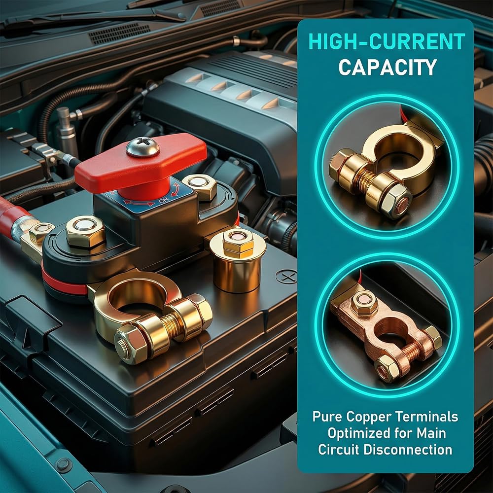 [Universal 12V/24V Compatibility for Multiple Applications]Works with both 12-volt and 24-volt systems, making it a versatile battery disconnect switch universal design. Suitable as a car battery power off switch for sedans, trucks, boats, and marine setups. One heavy-duty copper switch covers multiple needs without complex adjustments