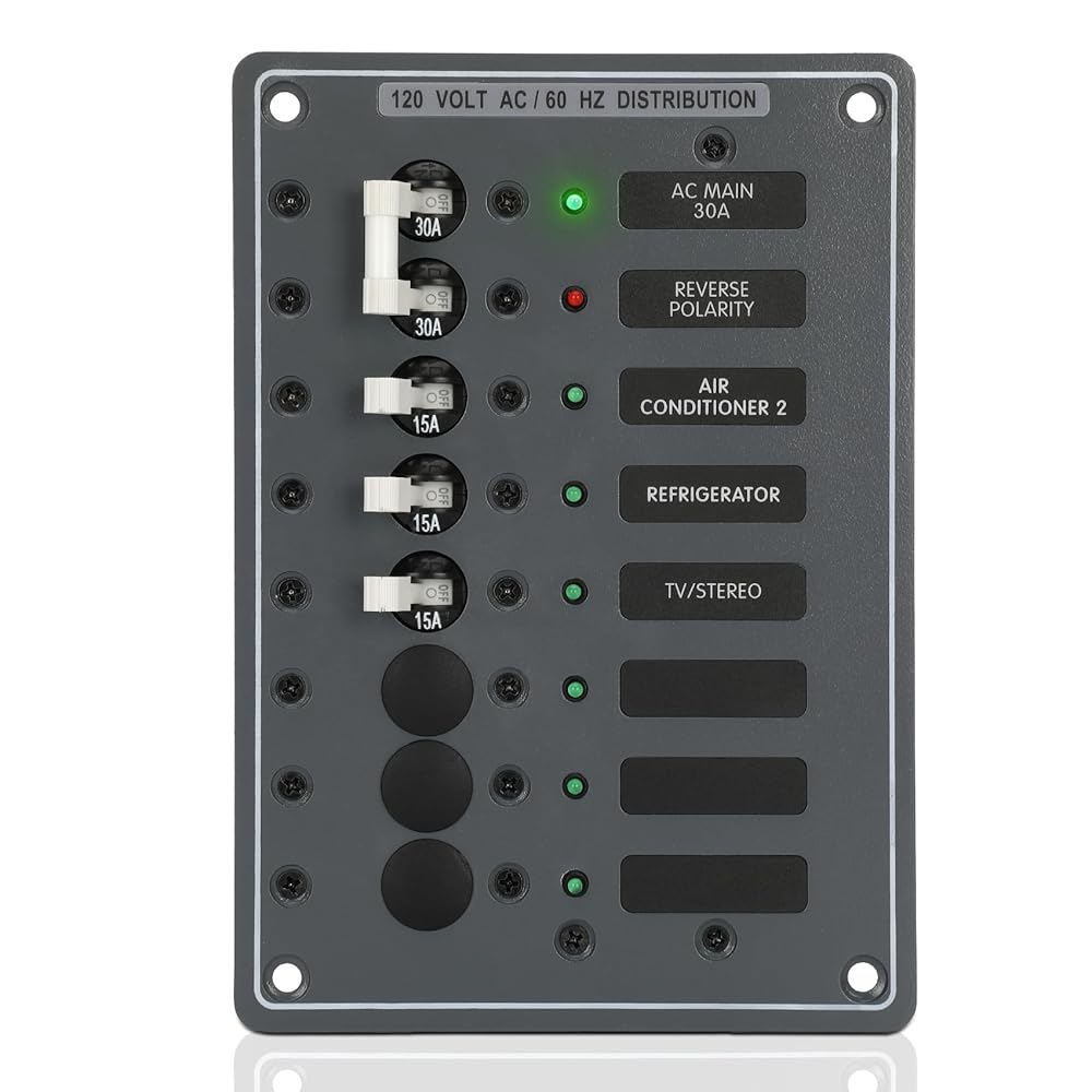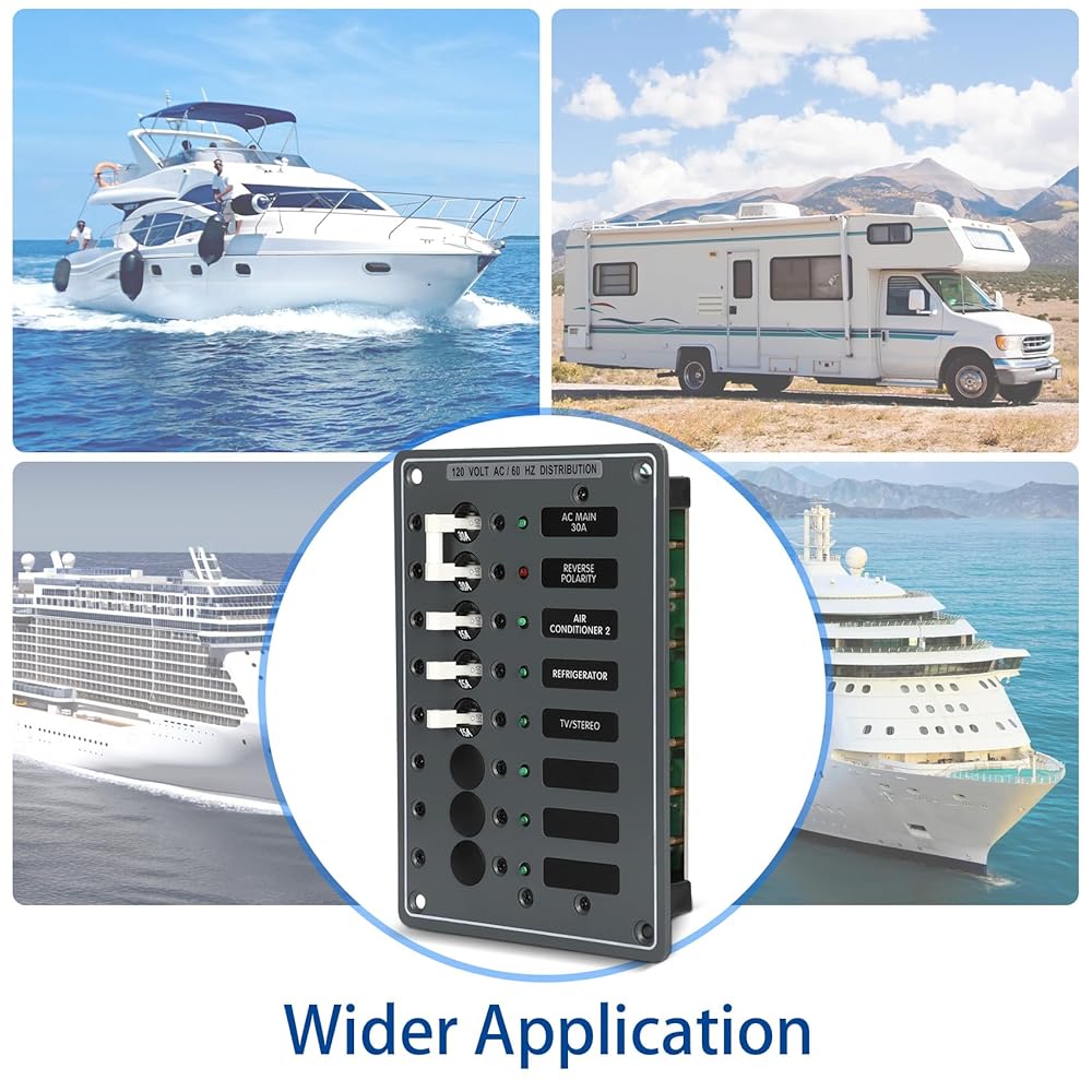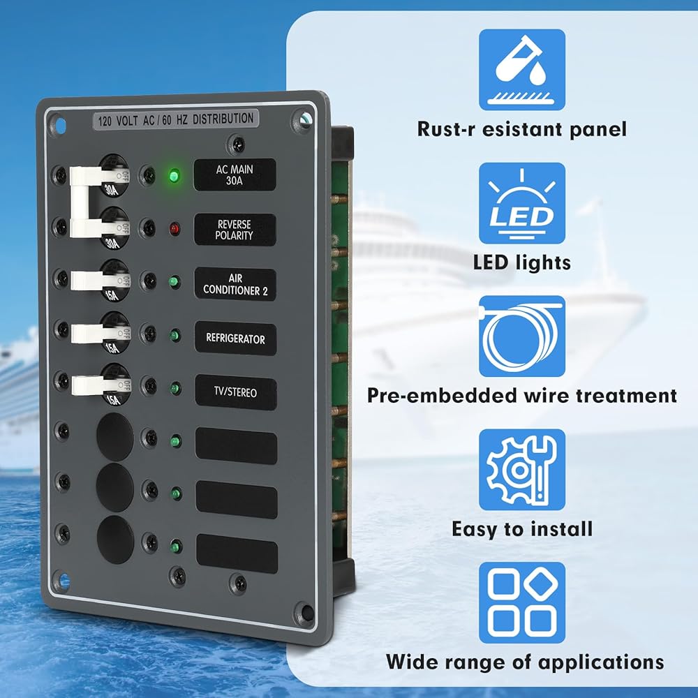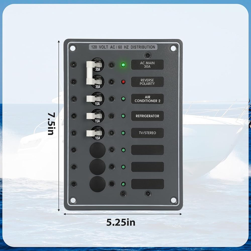 This 30A AC Main Breaker Panel combines the functions of a circuit master switch and circuit protection in one unit, with 1 pre-installed 30A double-pole circuit breaker (need to be switched together), 3 15-amp AC circuit breakers for branch circuits, 3 additional empty slots, and 14 frequently used tabs for expanding your circuits as needed. Panel features red reverse polarity LEDs and green LEDs to clearly indicate if the switch is on or not, making it easy to observe breaker status; all hot, neutral, and safety ground buses are installed and fully pre-wired. The breaker panel is made of rust-resistant material, which prevents the panel from rusting and prolongs its service life; The night backlight design makes it easier for you to read and operate the product. Provide AC power protection for your marine electrical system, safer to use. Ideal for boats, yachts, RVs, etc.