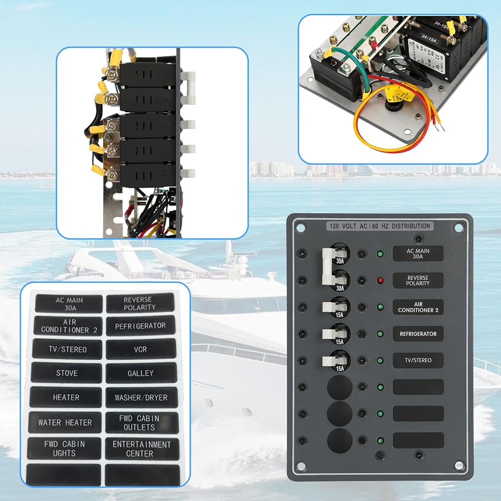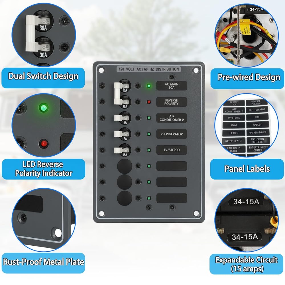 Ease of use: The panel comes pre-installed with one 30A double pole circuit breaker (to be switched together), three 15 amp AC circuit breakers for branch circuits to meet most marine circuit protection needs, and three empty slots, as well as 14 common labels to expand circuits as needed.