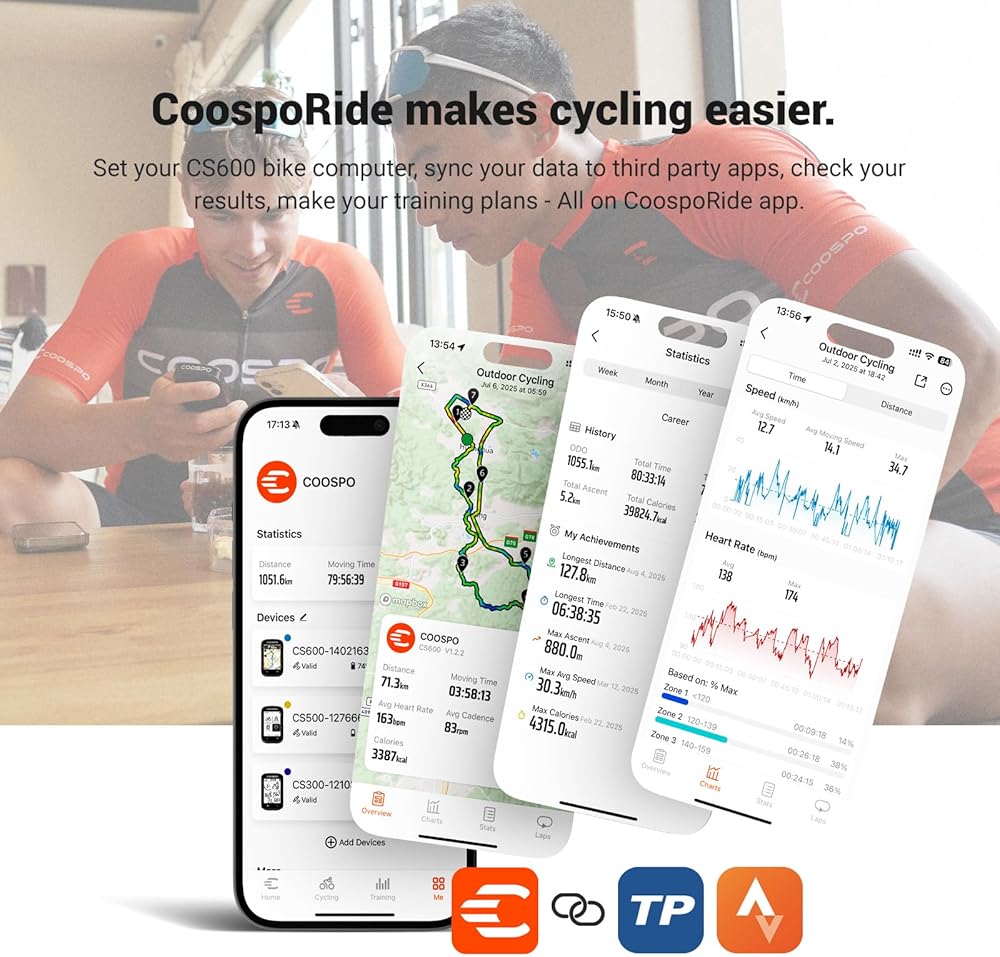 SEAMLESS WIRELESS SYNC: Easily connect to the COOSPORIDE app, Sync ride data automati cally to Strava and TrainingPeaks, create or sync custom workout plans directly to your device, with real-time prompts to hit your goals. Effortlessly share your achievements and analyze your long-term performance trends.