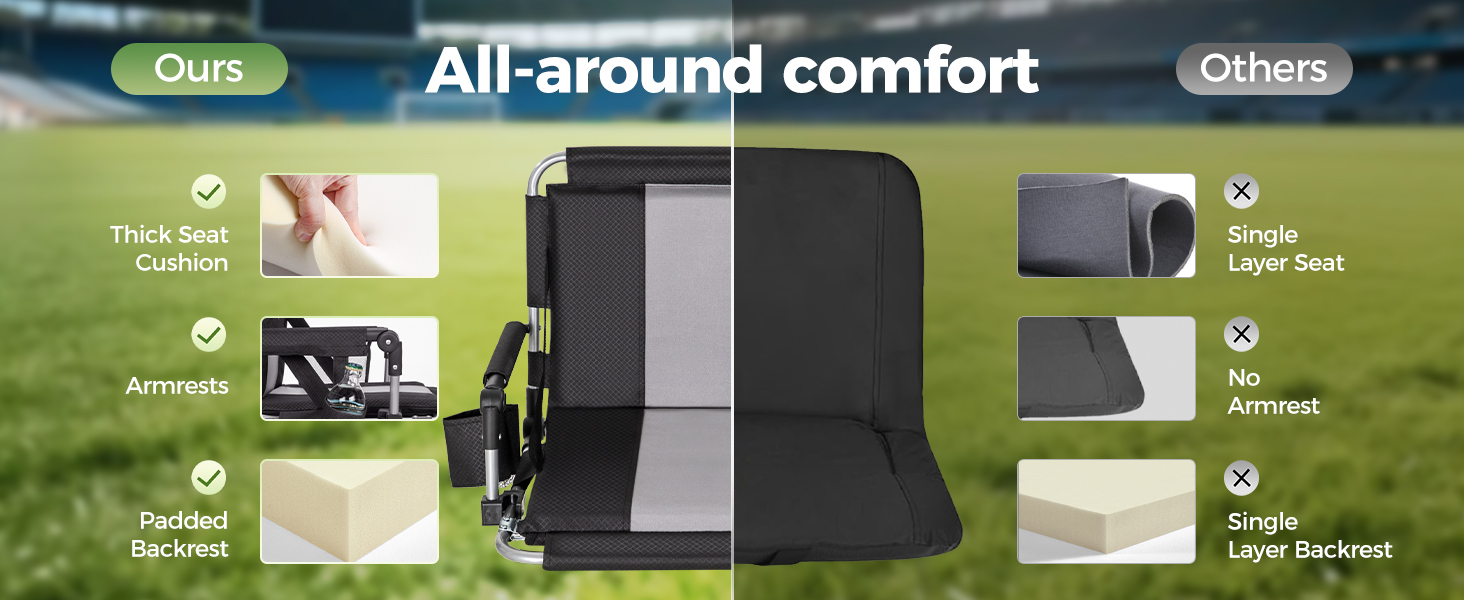 Superior Back Support & Thick Padding:Refuse hard and cold bleachers! With high-density thick foam padding and ergonomic back support design, you can keep your back straight and free of aches and pains even in overtime.