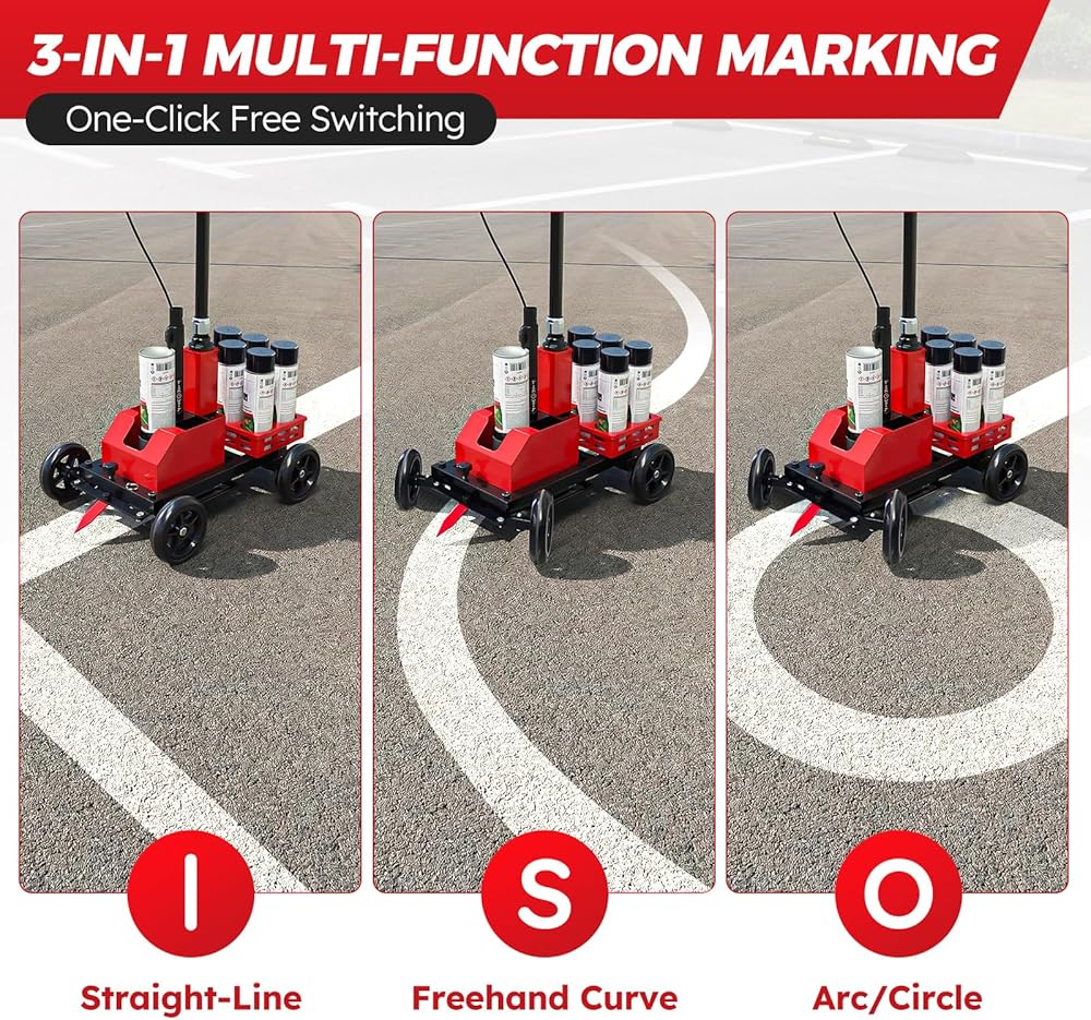 🏆【𝐌𝐔𝐋𝐓𝐈-𝐅𝐔𝐍𝐂𝐓𝐈𝐎𝐍 𝐌𝐀𝐑𝐊𝐈𝐍𝐆 - 𝐈, 𝐒, 𝐎】Zozen parking lot striping machine supports straight lines (I), free-steering curves (S), and adjustable fixed-radius circles (O) without additional tools. It is widely suitable for concrete, gravel, asphalt, grass, and other surfaces, making it ideal for parking lots, workshops, sports fields, construction sites, roads, lawns, and all areas requiring clear markings.