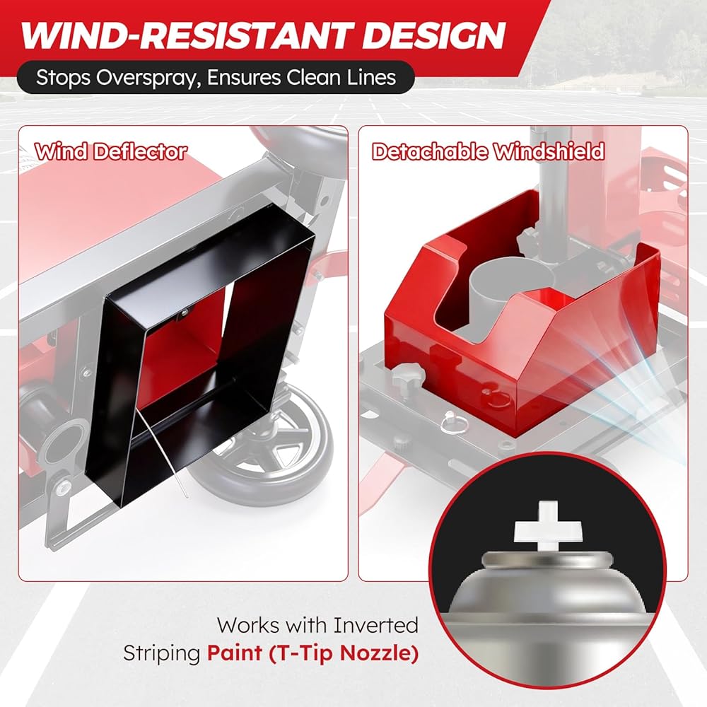 🏆【𝐇𝐄𝐀𝐕𝐘-𝐃𝐔𝐓𝐘 & 𝐏𝐑𝐎𝐅𝐄𝐒𝐒𝐈𝐎𝐍𝐀𝐋 𝐖𝐈𝐍𝐃𝐏𝐑𝐎𝐎𝐅 𝐃𝐄𝐒𝐈𝐆𝐍】① Constructed with heavy-duty steel for long-lasting durability and extended service life, able to withstand frequent outdoor use. Equipped with high-strength wheels for stable movement on uneven surfaces.② Features a windproof cover and bottom windproof plate, maintaining clean, sharp lines even in windy outdoor conditions, preventing messy edges and wasted paint—perfect for outdoor striping projects.
