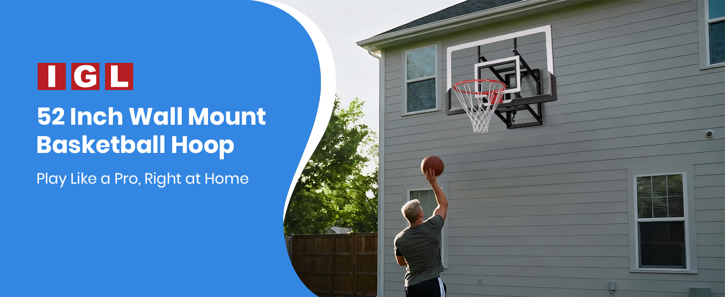 IGL Wall Mount Basketball Hoop, 52 Inch Wall Mounted Basketball Hoop Outdoor, 7.5-10 FT Adjustable Basketball Goal, Basketball Goal System with 18 Inch Pro Breakaway Rim, Reinforced Steel Bracket