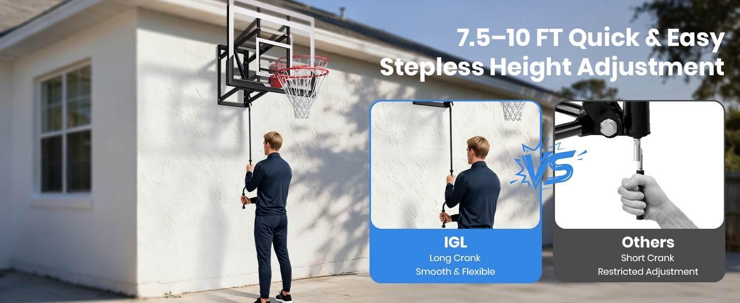 Upgraded Adjustment System: The basketball hoop wall mounted design includes a smooth hand-crank system for quick height adjustment between 7.5 and 10 ft. Players of different ages can easily set their suitable level