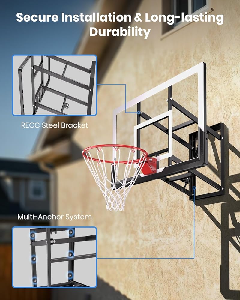 Shatterproof PC Backboard: This wall mount basketball hoop comes with a 52×32-inch shatterproof PC backboard that delivers realistic bounce. Designed for both indoor and outdoor basketball hoop setups, it withstands daily practice and play sessions