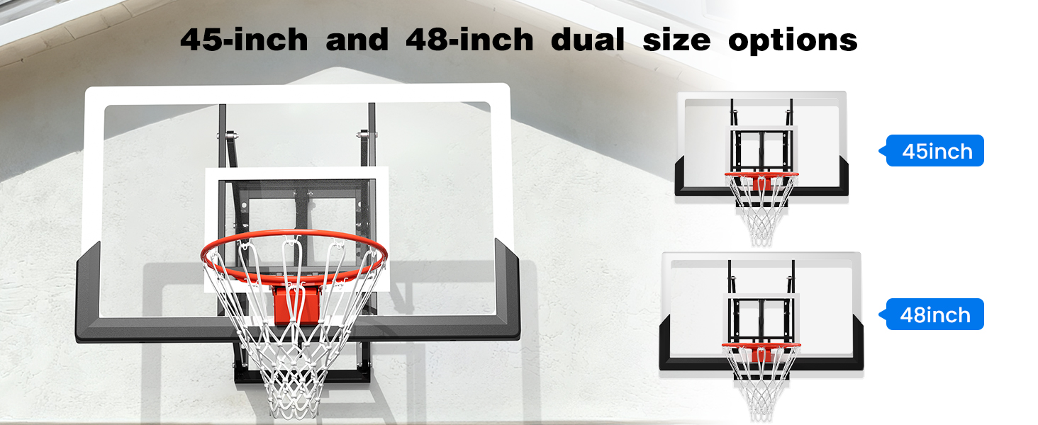 Shatterproof Backboard & Quality Rim: Equipped with a shatterproof 45 inch PC backboard and an 18-inch professional breakaway rim, it provides professional-grade performance whether used as an indoor/outdoor wall-mounted basketball hoop
