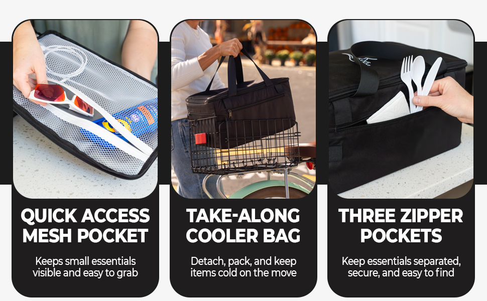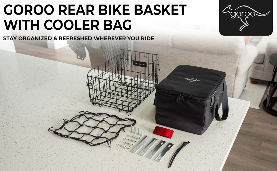 • Includes a removable Insulated Cooler Bag: PEVA-insulated cooler bag keeps food, drinks, groceries, and snacks chilled during bike rides; includes an internal net pocket to organize small items, perfect for picnics, commuting, or grocery delivery
