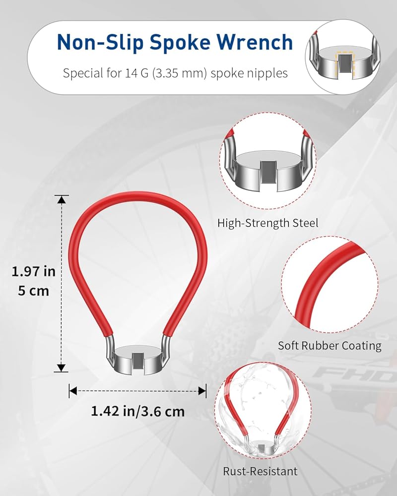 Non-Slip Bike Spoke Wrench: Specifically designed for standard 14 G (3.35 mm) spoke nipples. Made of high-strength steel, it withstands heavy use like a champ. The soft rubber coating ensures a secure grip and precise control, even with sweaty hands