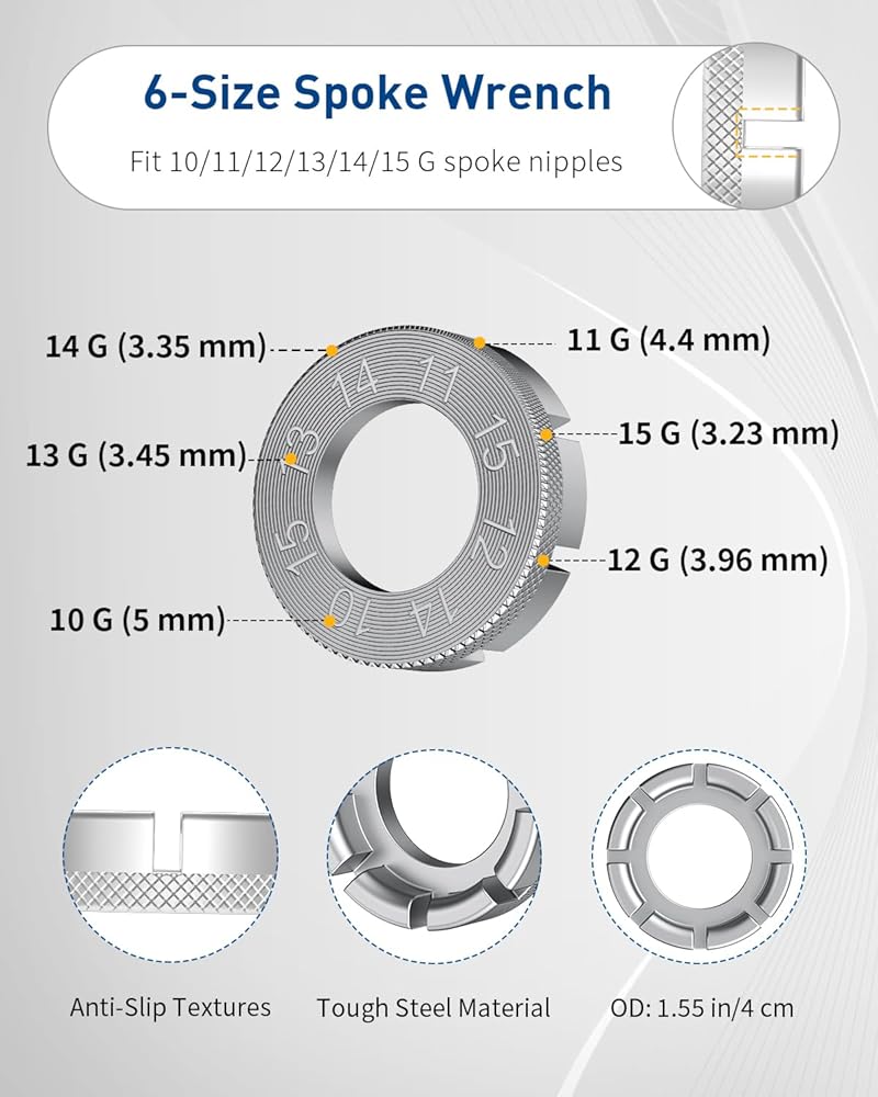 Universal 6-Size Spoke Wrench: Handle all common spoke nipple sizes with ease – 10 G (5 mm), 11 G (4.4 mm), 12 G (3.96 mm), 13 G (3.45 mm), 14 G (3.35 mm), 15 G (3.23 mm). Tough steel construction with an electroplated finish greatly resists wear and rust