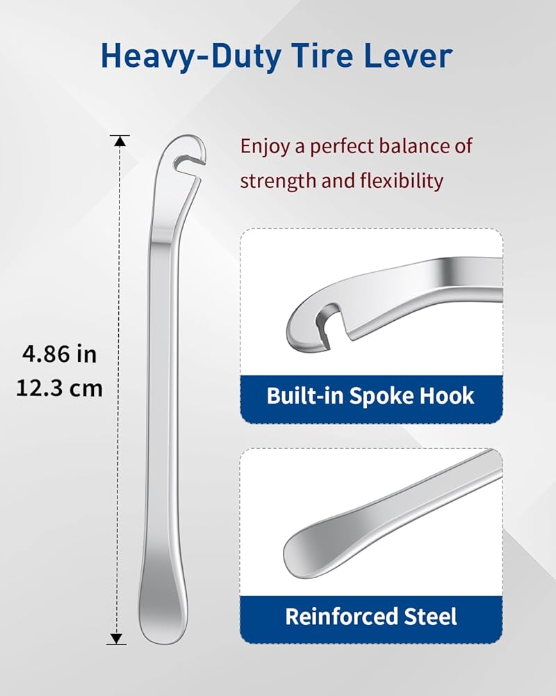 Heavy-Duty Steel Tire Lever: Enjoy a perfect balance of strength and flexibility! The reinforced tip withstands repeated use on stubborn tire beads, and the built-in spoke hook keeps the lever securely in place so you can use both hands effectively