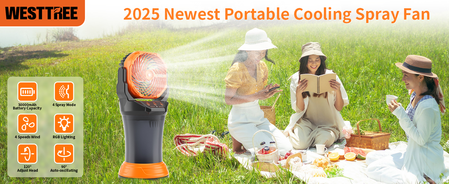 Multi-Angle Battery Operated Floor Fan - The mist fan features a 270° manual head adjustment tilt + 120° auto oscillation for full body coverage and cooling, so you can enjoy the coolness of a WESTTREE brand misting fan anytime, anywhere, such as in a tent, on the lawn, on a table, or in an RV for hands-free comfort.