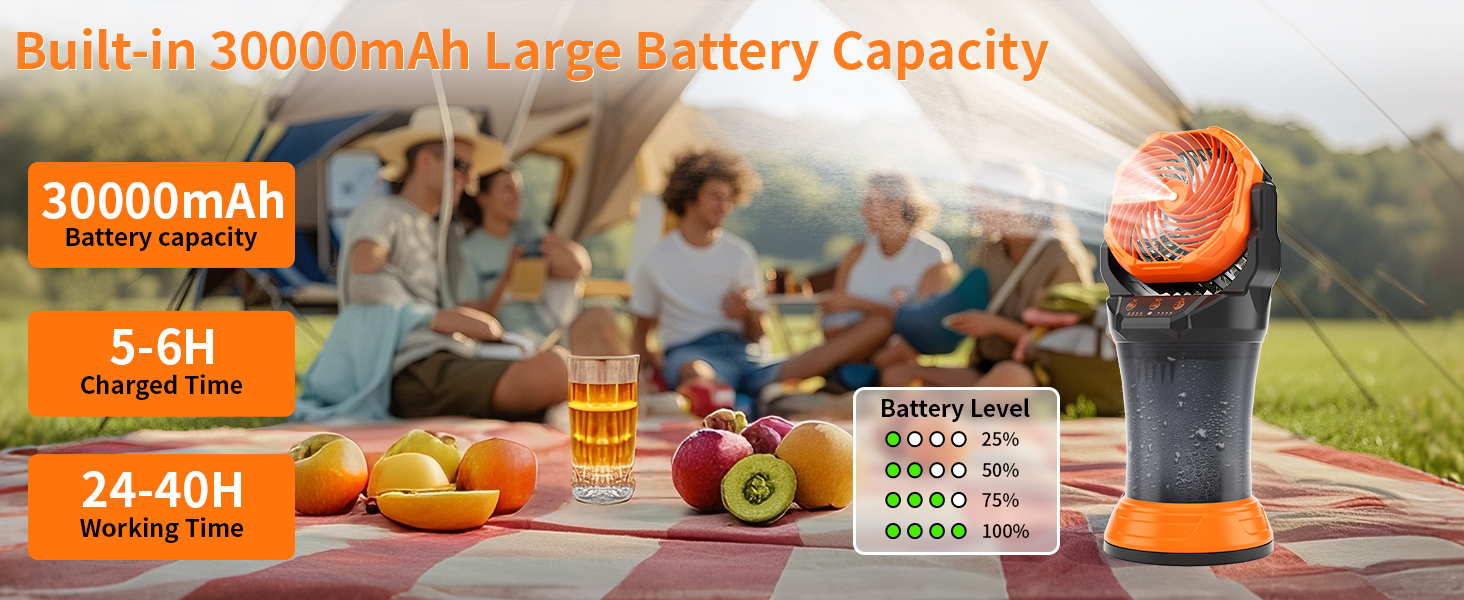 RGB Light Mode & Battery Indicator - This indoor/outdoor misting fan can cool down quickly while also featuring three modes of RGB lighting - Fixed Color, Fading Color, and RGB Walking Light, so you can switch between the desired light modes. Battery level indicator clearly shows the remaining runtime (25%/50%/75%/100%).