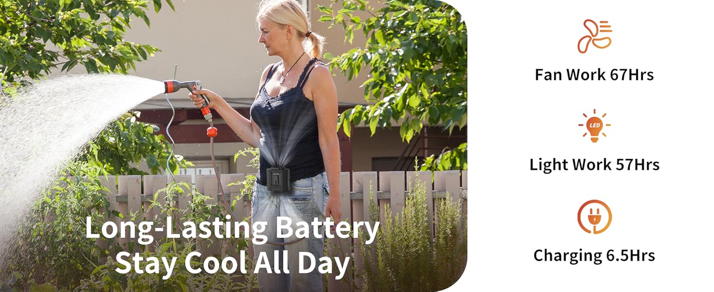 【Shirt Clip Cooling Fan On-the-Go】Due to the compact size of this wearable fan, weighing only 380 grams, making it easy to carry in your backpack, clips securely onto a belt, and is comfortable to wear without feeling bulky. Not only using an indoor office also brings a cooling feeling to outdoor activities, like courtyard working, fishing, hiking, camping, and traveling