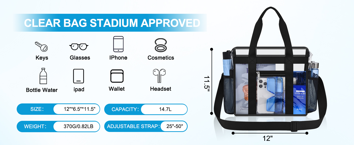 【حجم حقيبة شفافة لمناسبات الاستاد】 يبلغ مقاس حقيبة اليد الشفافة المعتمدة من الاستاد 30.48 سم × 16.51 سم × 27.94 سم، مما يضمن المرور السريع والسهل من خلال عمليات فحص الأمان الصارمة - مما يجعلها مثالية للحفلات الموسيقية والمناسبات الرياضية والمزيد.