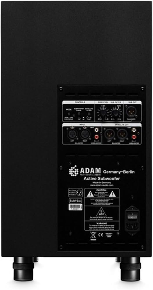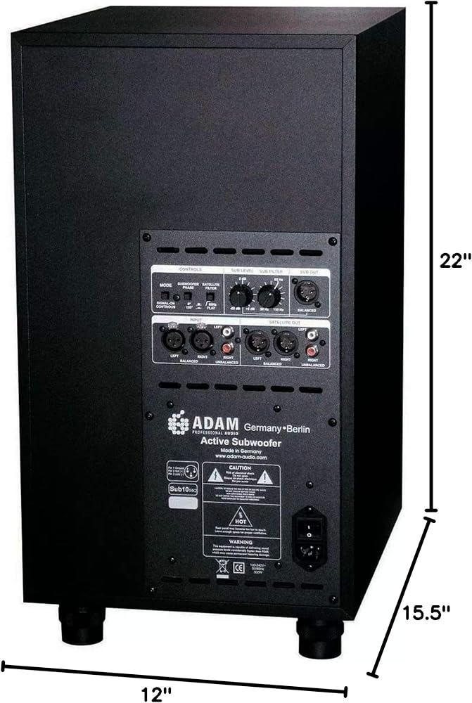 ADAM Professional Audio subwoofers are dedicated to ADAM Audio's primary goal: the best possible authenticity in the reproduction of music. For ADAM subwoofers, this means combining power and precision while simultaneously avoiding "impressive" bass volume at the cost of accuracy. Their task is it to complement the highly acclaimed lucidity and transparency of the ADAM monitors in the lower and lowest frequencies.All subwoofers up to the Sub2100 feature both balanced (XLR) and unbalanced (RCA) in and output connectors, and numerous controls to adapt to different room acoustics and requirements and a number of controls to adapt to different room acoustics and requirements.All units have a level control that varies from -60dB to +6dB, a phase ±180° switch and variable upper frequency barrier control (50-150Hz), a switchable 85Hz high pass filter for the satellite output. In addition, there is a 'signal-on/continuous' switch. This provides the option of automatic power up whenever the subwoofer receives a signal and automatic power off after 15 minutes of no signal.Sub10 Mk2The Sub10 Mk2 is a powerful subwoofer designed to extend the low frequency capabilities of any near or midfield monitoring and are ideal matches for ADAM monitors such as the AX- or the SX-Series.A large (2") voice coil is driven by a 200W Ice Power amp. This amp stays cool as it uses PWM technology in the amp and the power supply sections, producing > 90% overall efficiency, and can handle its maximum power without danger to the electronics or the driver. The Sub10 Mk2 houses an 10� woofer, capable of a frequency response of 25Hz - 150Hz. The larger Sub12 has a 12" woofer capable of producing a 3dB higher SPL max output and reproduces frequencies down to 22Hz.