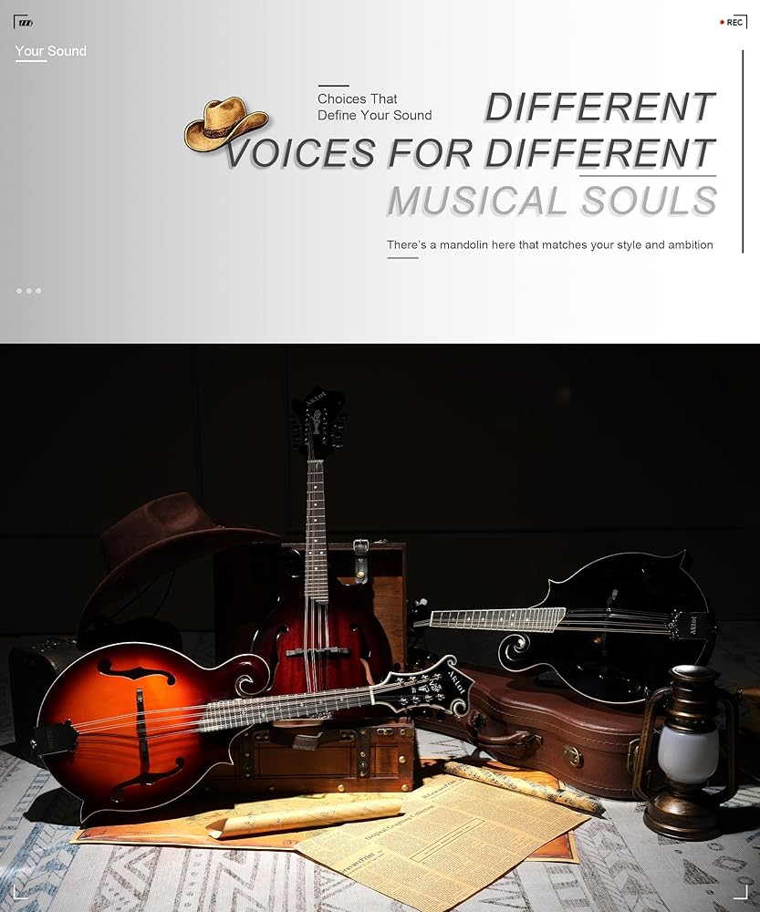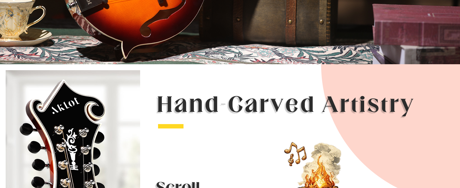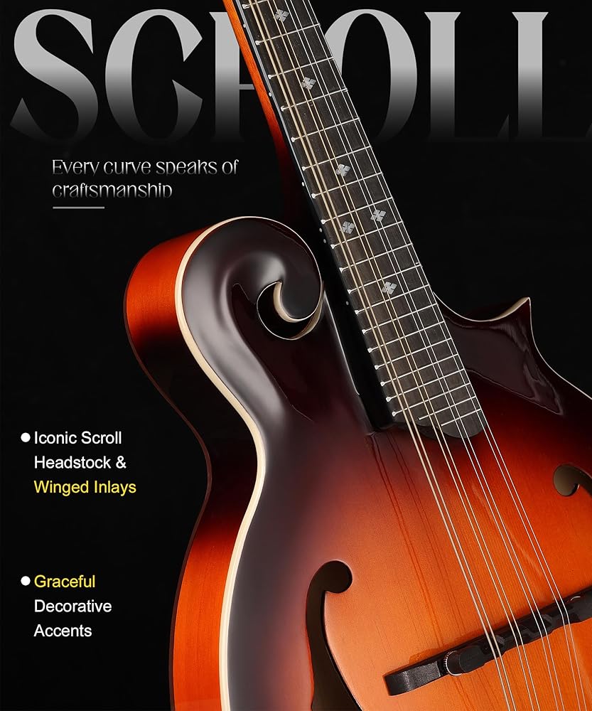 Carved Scroll Headstock: Your eyes are first drawn to the meticulously carved scroll headstock—the visual soul of this mandolin. Blending classical elegance into every curve, it transforms your instrument into a display-worthy piece when resting and a stage centerpiece when played. Every performance begins with this beautiful, ceremonial detail.