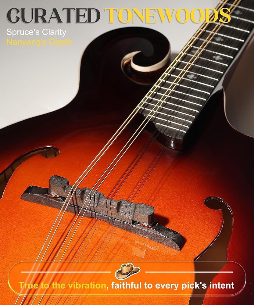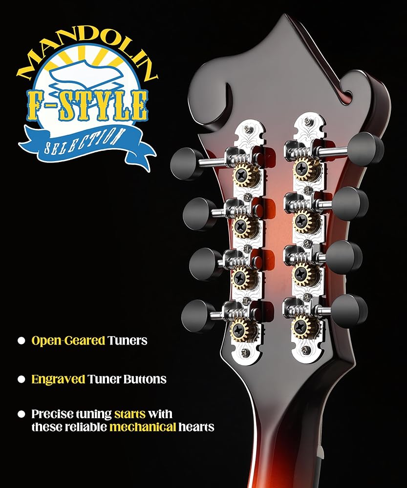 Unlock Fluid Play Up the Neck:On this F style mandolin, hardened nickel-silver frets offer smooth bending and sustained notes. Combined with precise neck joint at the 14th fret, you'll experience consistent comfort and reliable intonation even in higher positions. This allows fast runs and solos to flow effortlessly, fully unlocking the focused, penetrating voice characteristic of the F-style body.