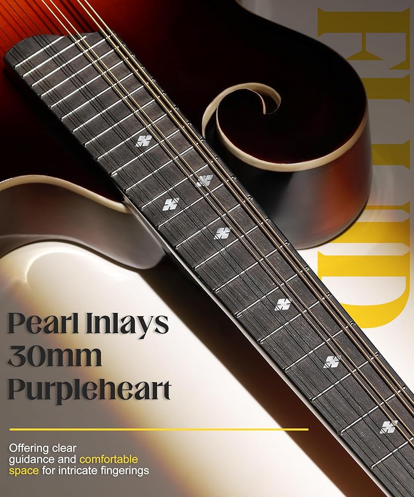 Your Trusted Platform for Play: The fretboard on this acoustic mandolin is widened for confident play. With 30mm of space crafted from durable purpleheart wood, even complex chords and fingerings feel approachable. The naturally resilient wood, reinforced with ABS binding, stands up to frequent use, ensuring your mandolin remains a reliable partner through daily practice and performance.