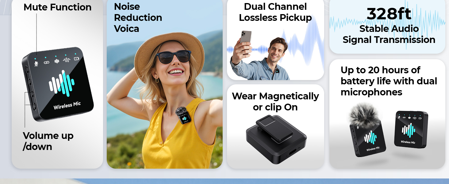Smart Modes & One-Touch Control: Easily switch between three professional modes—Noise-Cancel, Pure Silence, and Immersive Reverb—with a single button. Exclusive 3-level gain tuning allows you to customize the sound for conferences, recordings, or live vocals, making this deep grey wireless lavalier microphone incredibly versatile and easy to use