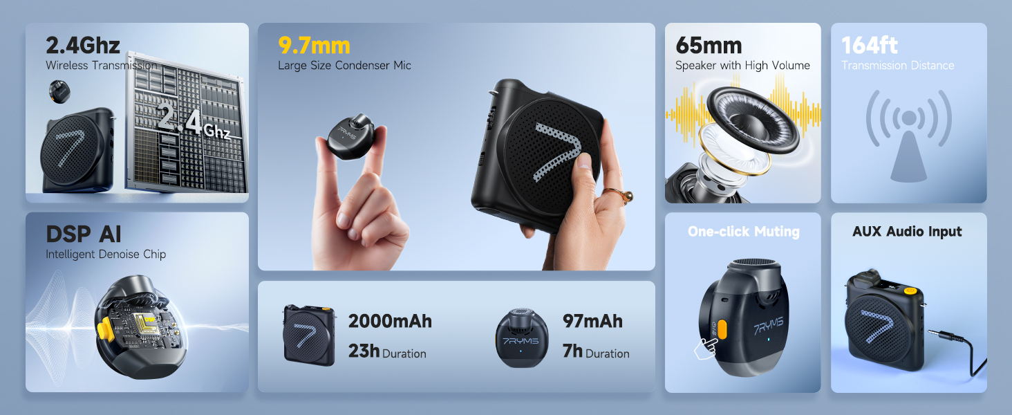 【2.4GHz Wireless Transmission,164ft Working Range】7RYMS WA2 Portable Speaker adopts 2.4G automatic frequency modulation technolog, which make the working distance up to 164ft, Perfect Valentine‘s Day Gift for teaching, trainer, singer, coacher, tour guide, shopping guide, presentation, outdoor speech and etc.