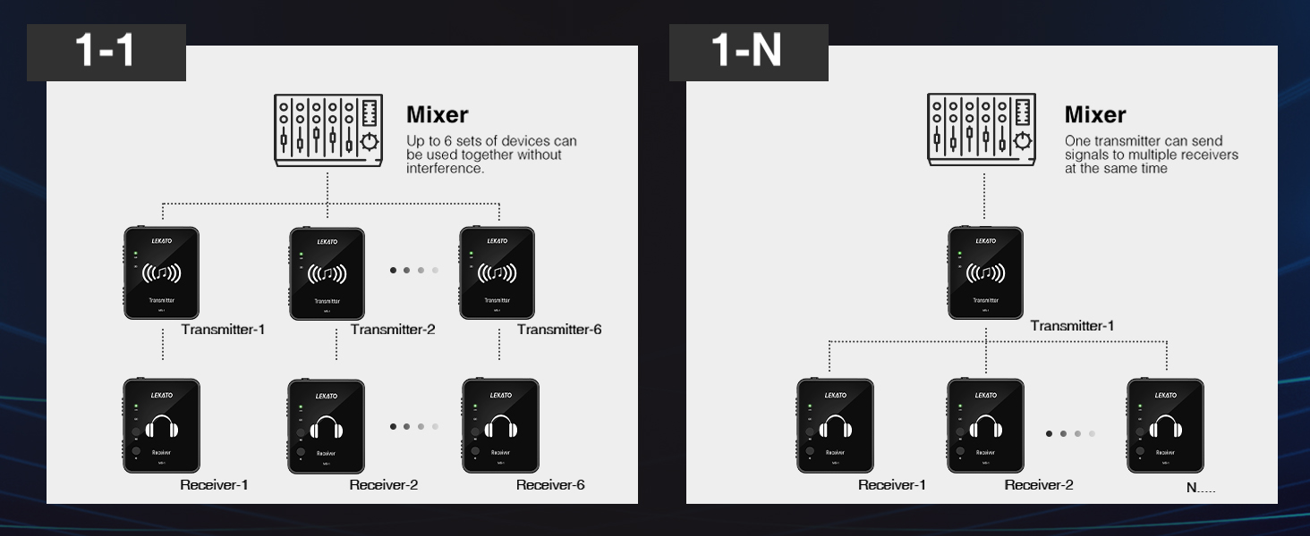 【One TX to Many RXs】Support up to "6" sets of device work simultaneously at the same time, and multiple receivers can be paired to single transmitter, and there is no limits!!! Perfect for small/medium stage gigs or daily band practice.