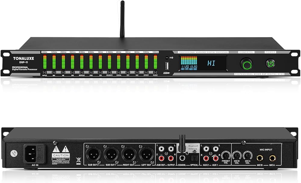 Digital Karaoke Mixer Audio Processor System with DSP, Professional Pre-Stage Effector Vocal Effects Preamp KTV Equalizer, Anti-Howling Microphone Sound Processor w/USB Bluetooth Optical Audio Input