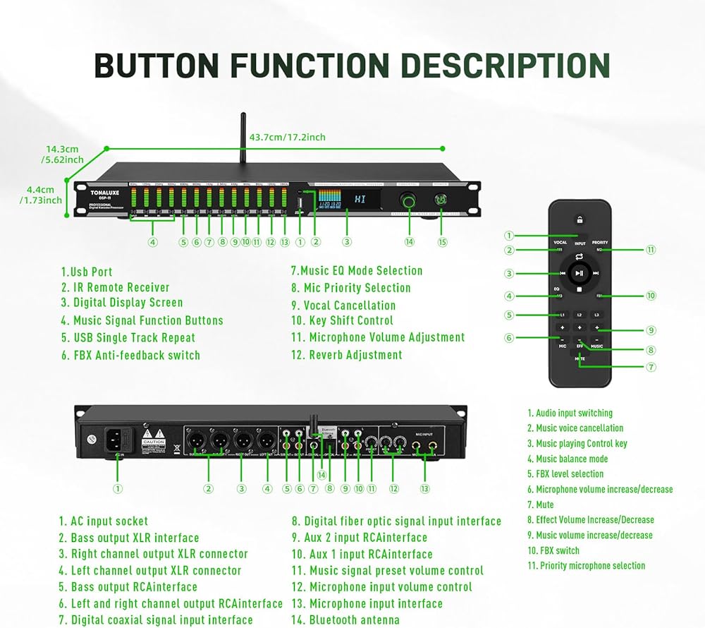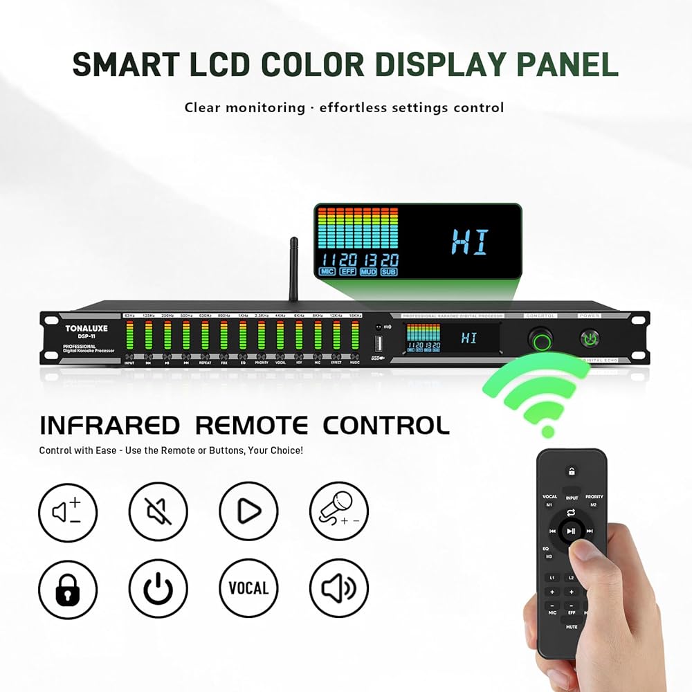 User-Friendly Multi-Function Control Panel: Designed for quick adjustments and smooth operation. Easily control source selection, sound tone, microphone effects, and feedback elimination—all from a clean, intuitive interface. Perfect for home karaoke, events, studios, or professional audio systems.