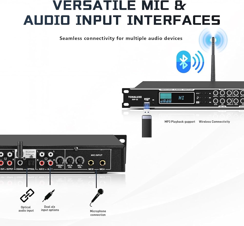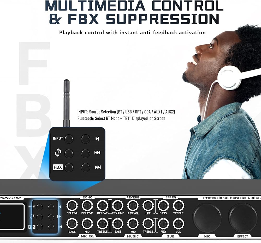 Karaoke Processor System, Digital Pre-Stage Effector Vocal Effects Preamp KTV Mixer Equalizer with 4-level FBX, Anti-Howling Microphone Sound Audio Processor w/ USB Bluetooth Optical Audio Input