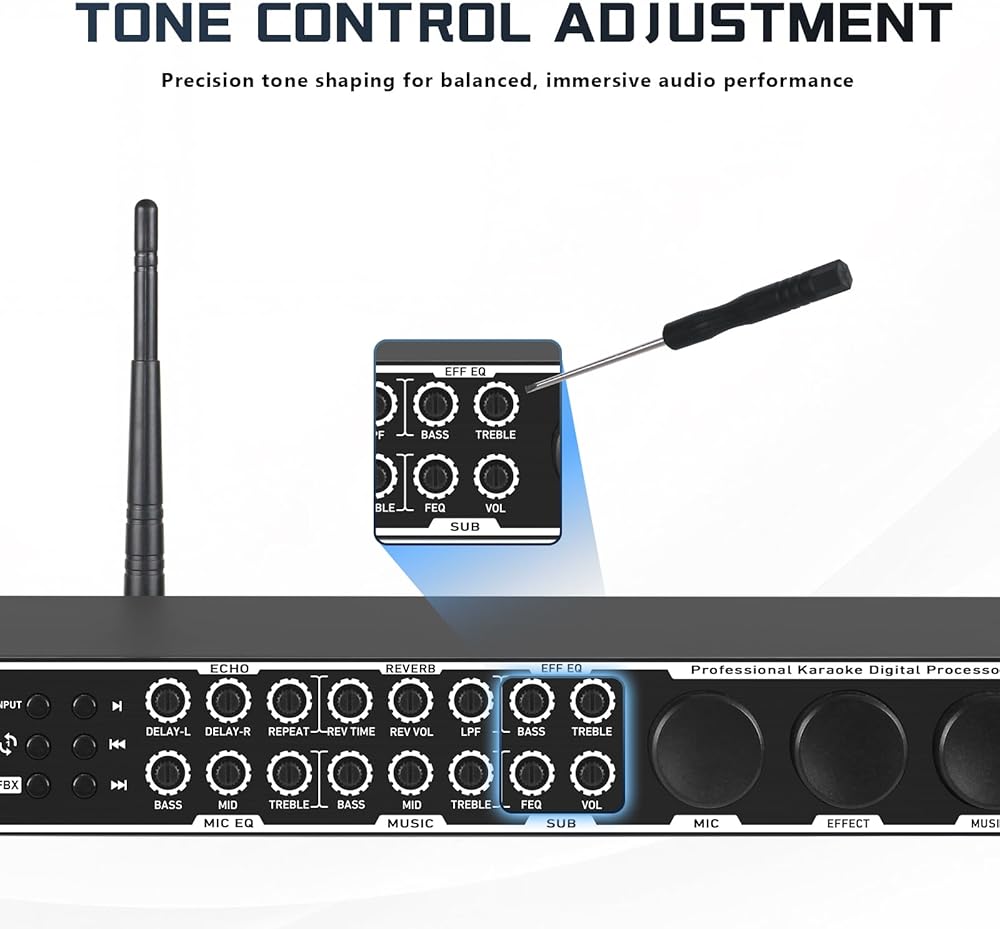 Precision Mic & Tone Adjustment for Enhanced Sound: Fine-tune vocals and music with comprehensive mic and tone parameter adjustment. Benefit from professional vocal processing for clearer, fuller microphone performance, and precise EQ control for balanced, immersive sound. Perfect for singers, hosts, and home karaoke enthusiasts.